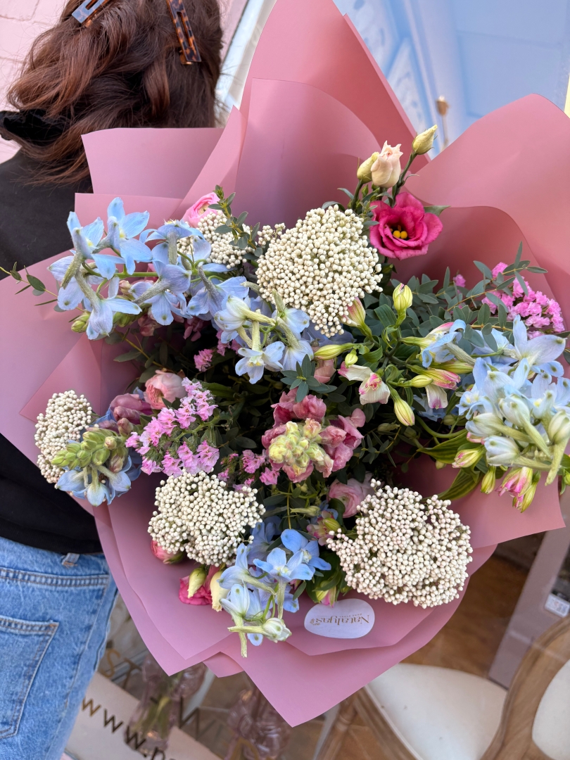 A beautiful hand tied bouquet with an assortment of garden florals, including delphinium, lisianthus, tie flowers and minimal greenery.