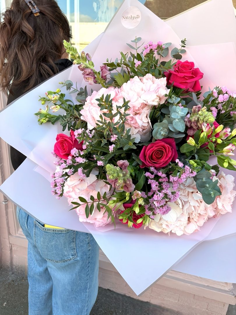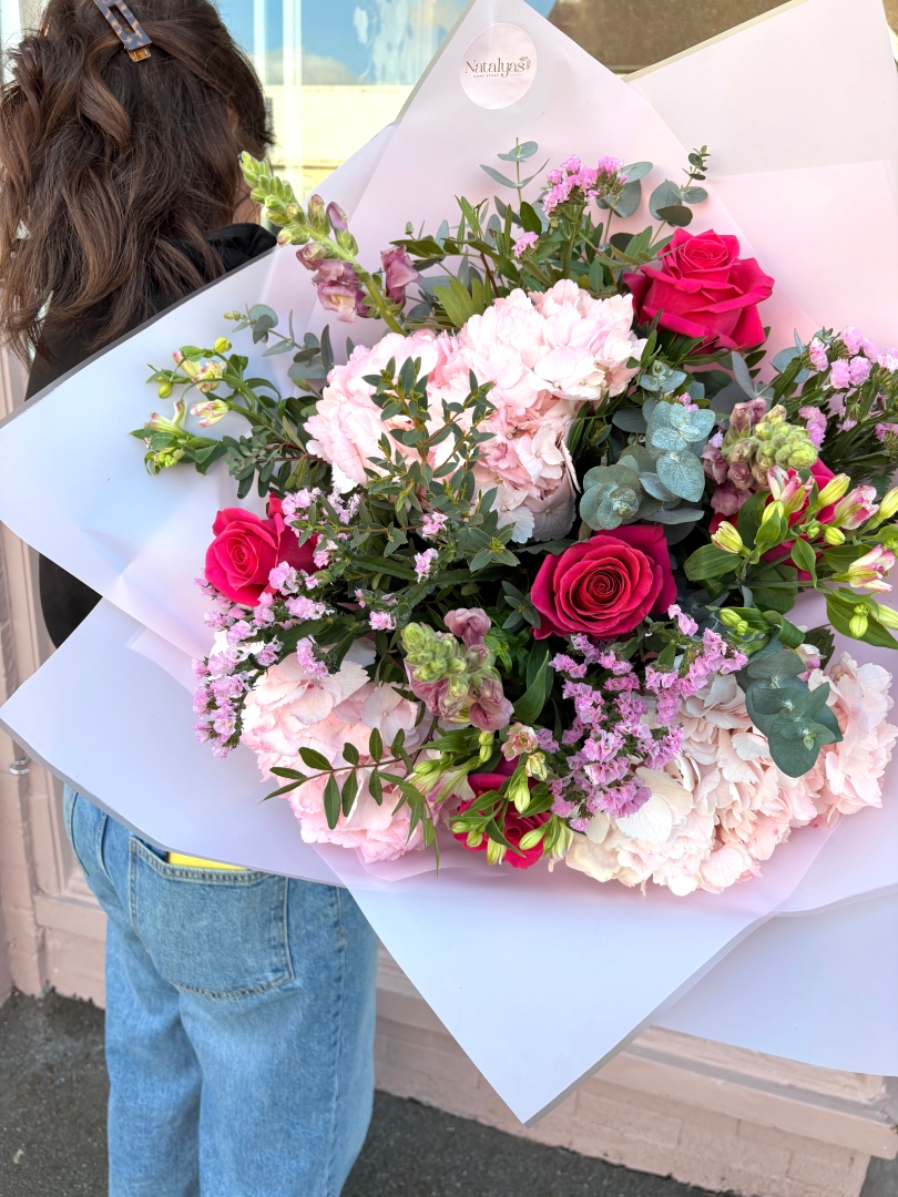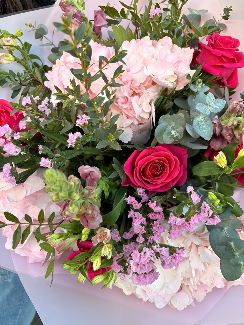 A selection of pink and pastel flowers including large pink roses and hydrangeas with foliage - gifted in a box with water and a beautiful bow. All Mums love anything Pink!