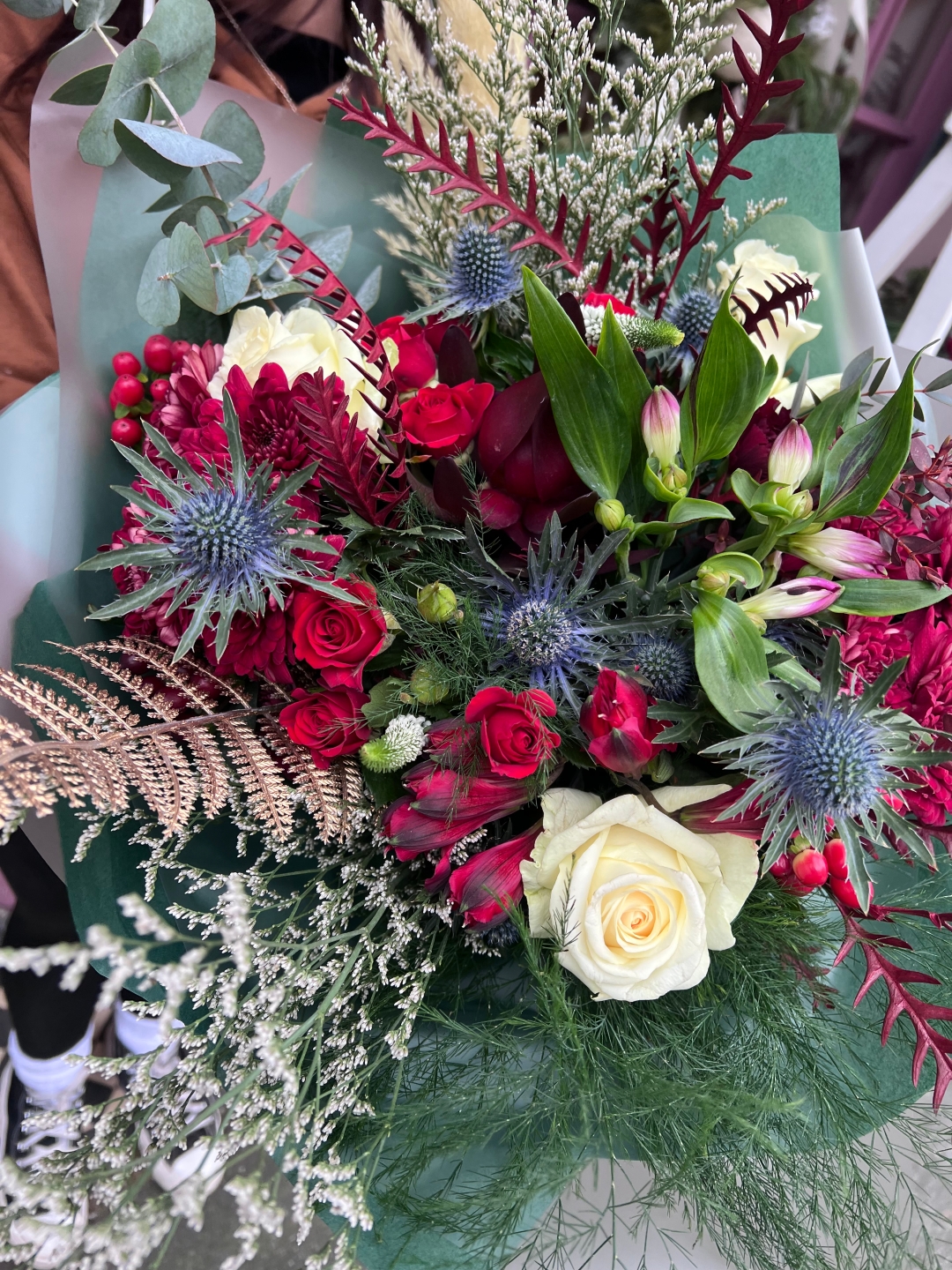 The deluxe hand tied Christmas bouquet, gifted in a box with festive bows and gifting paper.